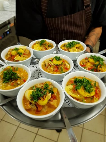 O cardápio do buffet é composto por mais de 120 itens, pratos autorais, releituras de iguarias do Brasil e do mundo afora. O menú degustação compoe entradas, pratos principais, doces/sobremesas e bebidas.